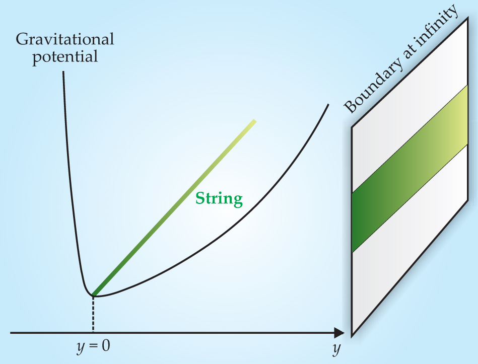 Figure 5. A string theory of quark confinement. A long fundamental string that has fallen to the bottom of the gravitational potential energy well describes the so-called color flux tube in a confining gauge theory at the boundary of the extra dimension. Such strings explain why the potential energy between a quark and an antiquark rises linearly with their separation and prevents the two particles from escaping to freedom. The thickness of the string in the gauge theory is related to the position of the fundamental string in the y direction.