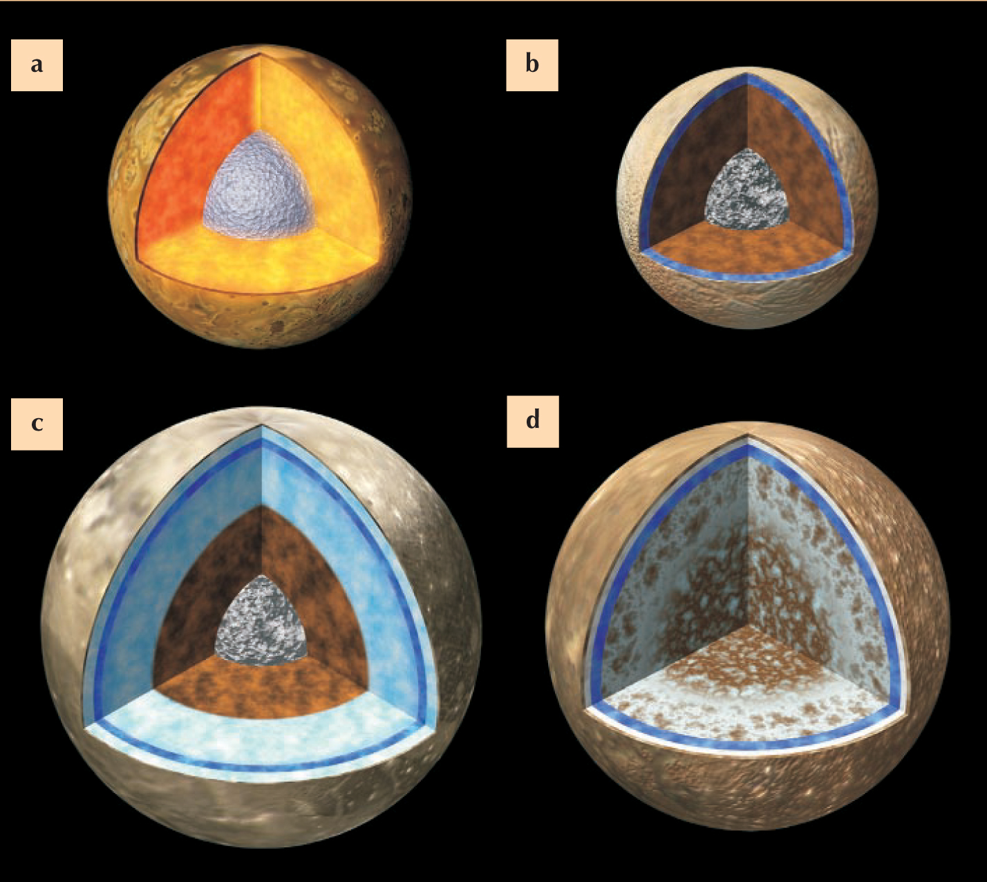 Figure 1. Internal structures of the Galilean satellites can be modeled with the help of moment-of-inertia data. (a) Io, the moon nearest to Jupiter, is highly differentiated, with a high-density core and lower-density outer regions. (b) Europa, next in order, features a layer of water or ice some 75–150 km thick over a denser region of iron and rock. (c) Ganymede, like Io, is highly differentiated. (d) Callisto, farthest from Jupiter, shows surprisingly little differentiation.