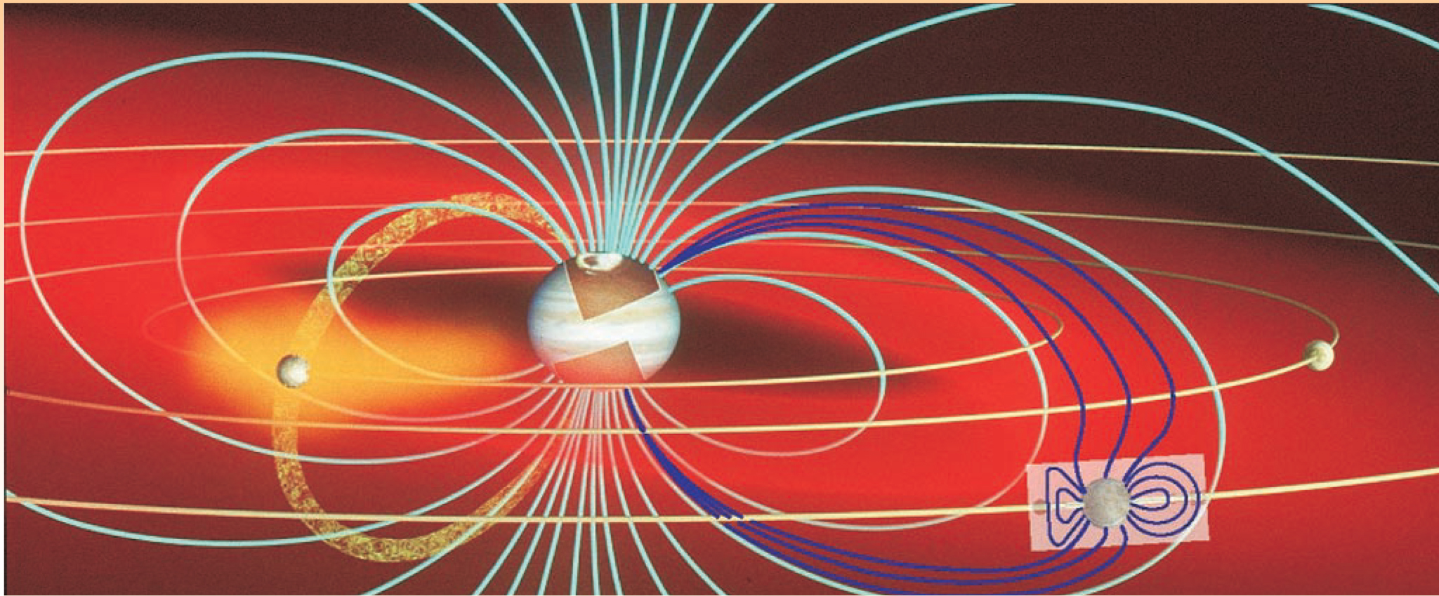 Simple geometry explains the time-varying magnetic field seen by the Galilean satellites. The satellites orbit in Jupiter’s equatorial plane, but the planet’s field is tilted by about 10° from its spin axis. As a result, during Jupiter’s 10.5-hour rotation period, the satellites are exposed to a strong magnetic field that oscillates significantly in the direction to and from Jupiter but varies little in the north–south direction. An electrical conductor placed in such a time-varying field develops eddy currents that produce a magnetic field counter to the imposed field.