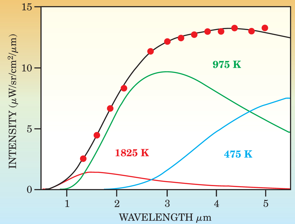 Figure 4. Temperatures of volcanic fluids are occasionally much higher than those observed in terrestrial volcanoes. The data shown here (red points) were taken by the near-infrared mapping spectrometer at the Pele/Pillan region of Io. The best fit curve (black) was derived from a three-temperature model (colored curves). Volcanic fluids from present-day Earth volcanoes do not reach temperatures as high as 1825 K.