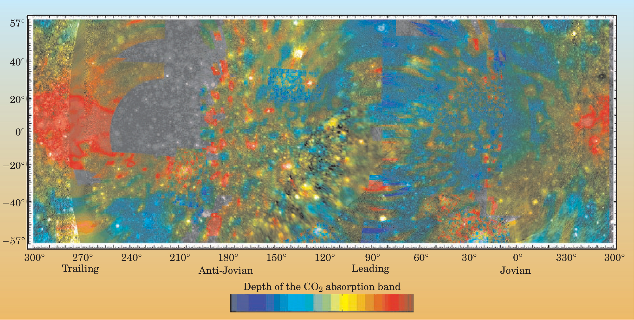 Spectra of Callisto show the clearest signature of the non-ice material, which is present in larger quantities on that satellite’s ancient cratered surface than on the surfaces of younger Ganymede and Europa. The spectral band in the 3- to 5-µm range—a region largely inaccessible to Earth-based spectroscopy due to strong CO2 absorptions in Earth’s atmosphere—reveals several new key absorption features. Indeed, the strongest of those features is due to CO2 on Callisto’s surface. Analysis of the absorption suggests that it is due to a condensed form of CO2, neither pure solid nor pure liquid, possibly in microdeposits or inclusions in the other surface material. Maps of CO2, such as that shown in Figure 5, demonstrate that the compound is present in clearly defined local regions. A global pattern to the surface abundance is apparent as well: A greater quantity of CO2 is evident in the hemisphere centered on 270° longitude, where magnetospheric plasma bombards the satellite. The correlation with plasma bombardment suggests that the formation of CO2 deposits is related to radiation-induced damage to surface materials or to radiation-induced chemical processes.