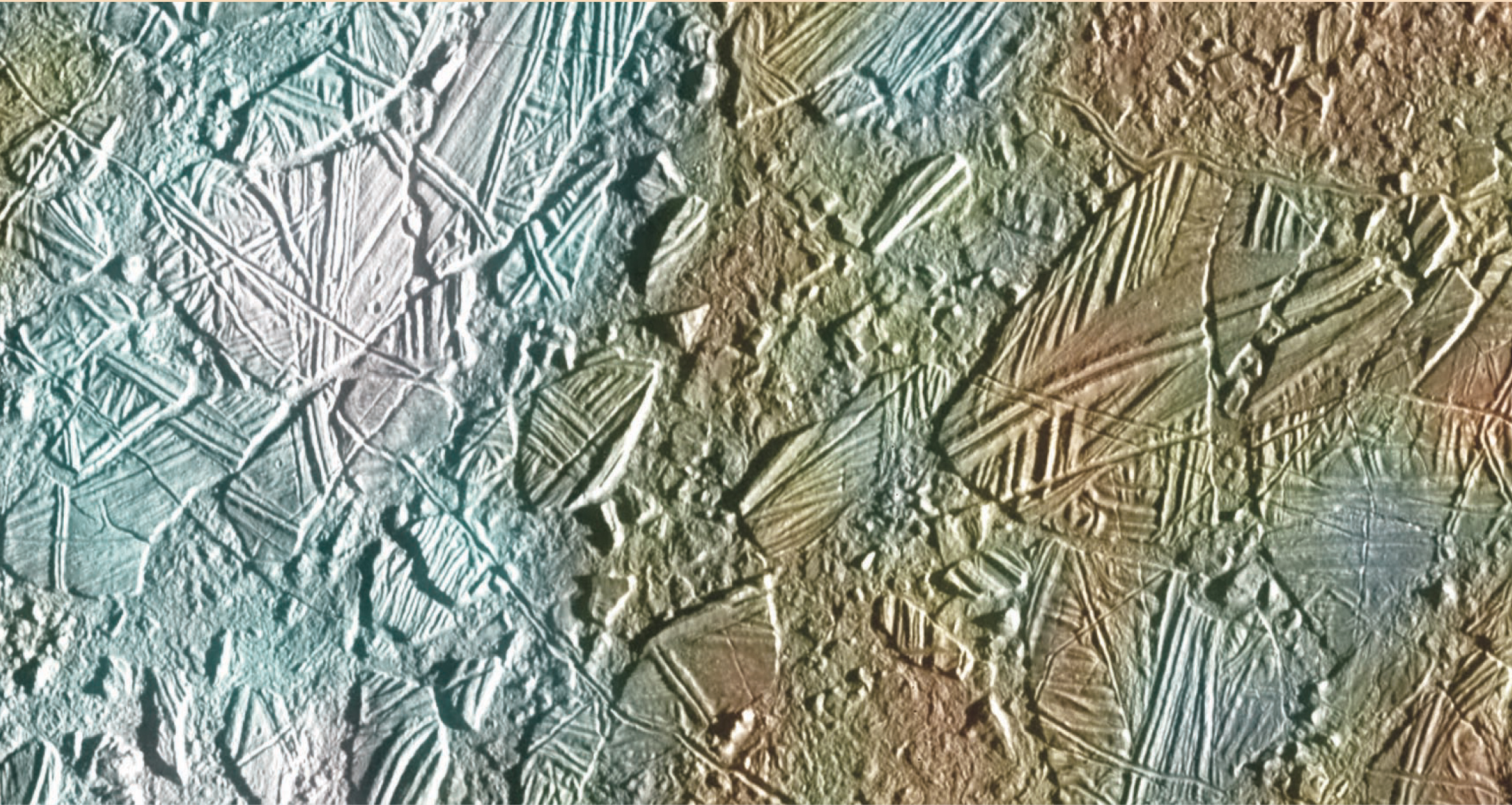 Figure 6. Europa’s Conamara Chaos region presents an arctic landscape. This image shows an area 30 km × 70 km. The moon’s smooth surface is one piece of evidence suggesting a subsurface ocean.