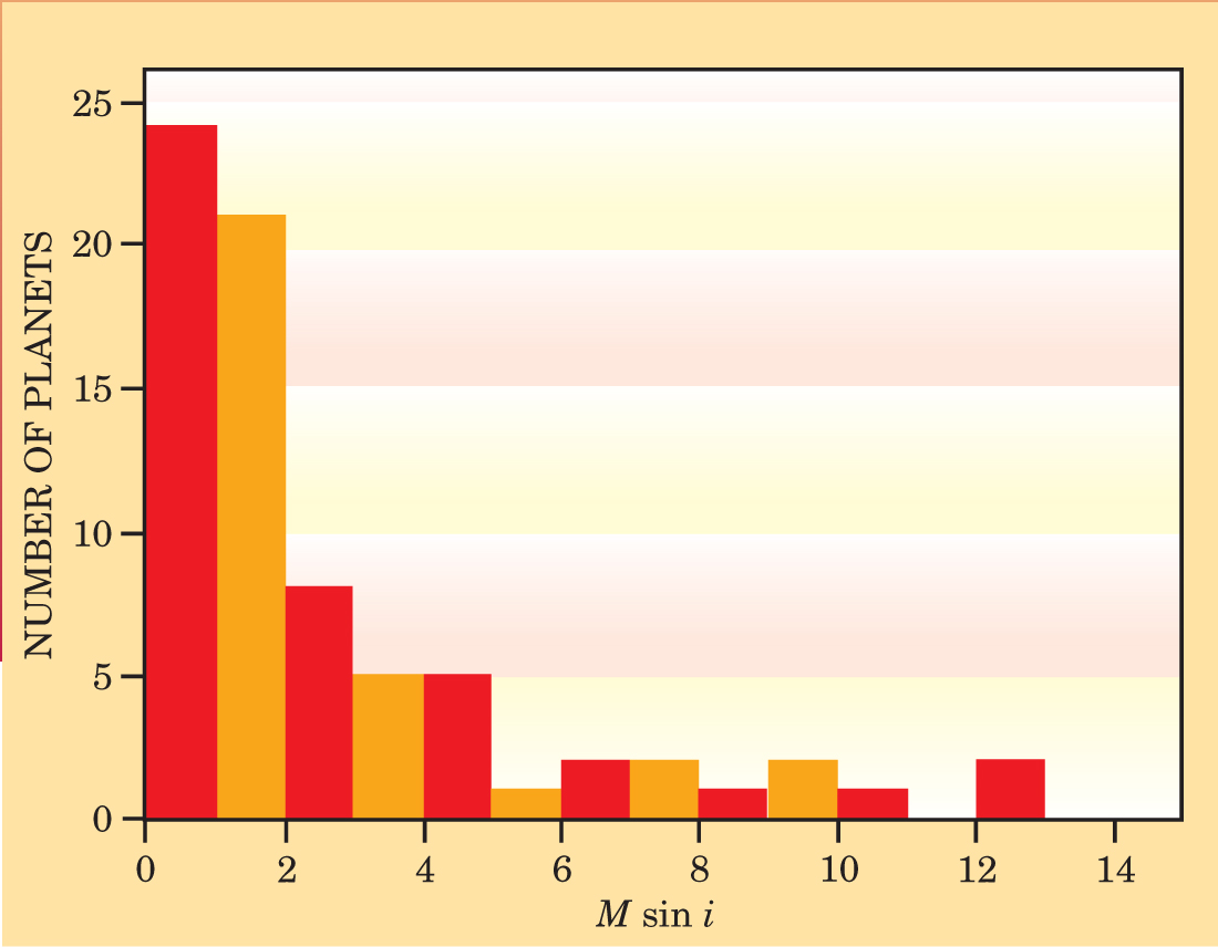 Figure 1. The spectrum of masses among the extrasolar planets found so far exhibits a break close to 13 Jupiter masses. Among the 75 planets plotted here, the distribution peaks at low mass even though such planets are the hardest to find. To detect and measure the extrasolar planetary masses, scientists look for a Doppler shift in the spectral lines from the atmosphere of stars. The method yields M sin i, in which M is the mass (scaled to Jupiter) and i is the angle between the orbital plane normal and Earth’s line of sight.