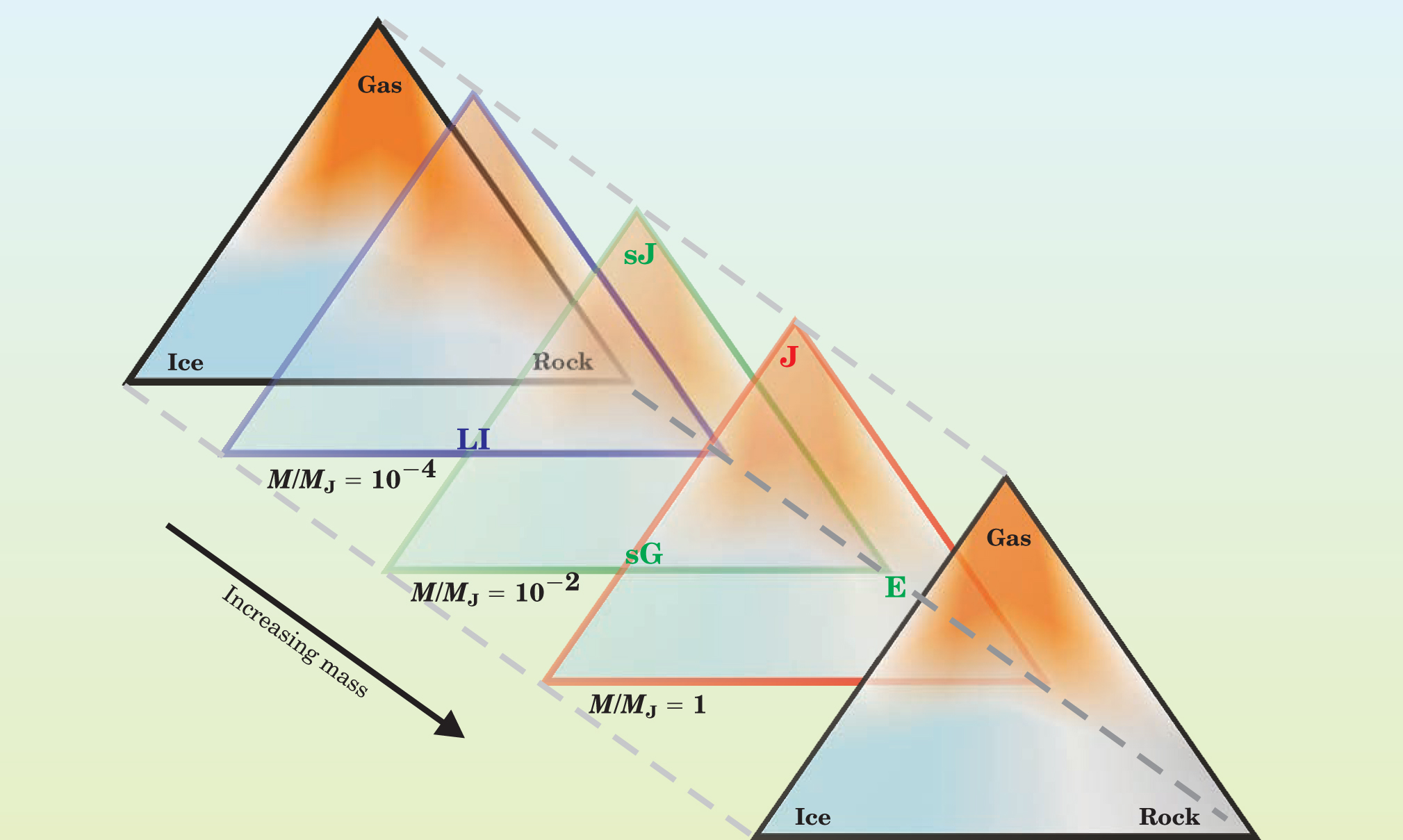 Figure 2. This prism encompasses all possible planets in the universe. Gas, ice, and rock define each vertex of the prism, and the third dimension is mass in units of MJ the mass of Jupiter (J). E refers to Earth, and LI to large icy satellites such as Ganymede. Two other classes of bodies are not found in our solar system: sub-Jupiters (sJ), bodies like Jupiter but much less massive and super-Ganymedes (sG), bodies like Ganymede but much more massive.