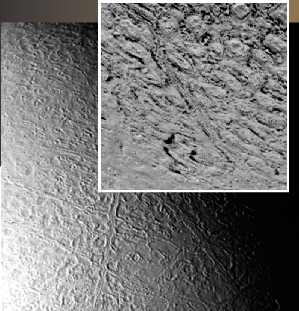 Figure 3. Triton is a planetary moon that orbits Neptune. This picture and its inset, taken by Voyager 2 in 1989 from 80 000 and 25 000 miles, respectively, show an icy surface scarred by enormous cracks. Triton’s planetary evolution is still poorly understood, and the surface deformation may be a testament to the role of planetary processes even on bodies that are less massive than Earth’s Moon.