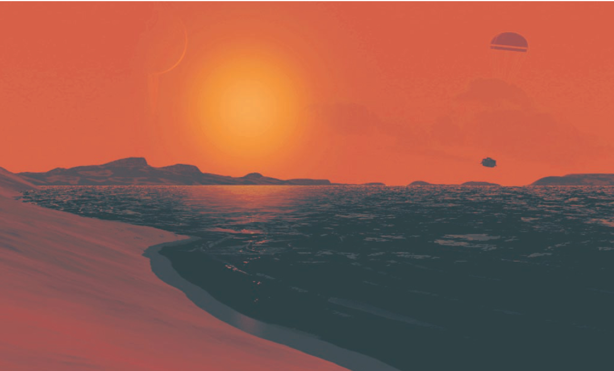 Figure 4. The Huygens probe will drop into the dense, smoggy atmosphere of Titan in January 2005 after the current Cassini mission reaches Saturn. Part of the surface may be lakes or oceans of methane, ethane, and other hydrocarbons, and part may be outcrops of “bedrock” water ice. Although the actual splashdown site is planned for the side of Titan where Saturn is not visible, this artistic impression is somewhat realistic and based on current knowledge, including a possible inclination and faint appearance of Saturn for a near-equatorial view on Titan. The atmosphere might not seem as transparent to the human eye as rendered here, but is transparent at some near-infrared wavelengths.