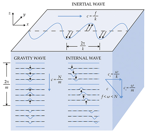 All waves have a dispersion relation, which quantifies the relationship between wavelength and frequency in terms of certain physical parameters. The two important parameters for internal waves are the Coriolis frequency and the buoyancy frequency. The Coriolis frequency f is the vertical component of Earth’s rotation vector at a fixed point on its surface and depends on latitude. The value of f sets the minimum frequency for internal waves. Those oscillating at that frequency are called inertial waves, and they propagate horizontally, as shown in figure