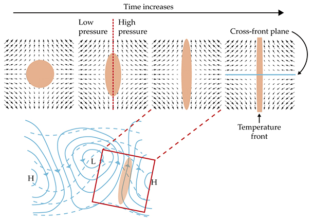 Frontogenesis. In the lower image, a front forms between high-pressure (H) and low-pressure (L) weather systems; isobars are shown as solid lines. Isotherms (dashed lines) are squeezed together in regions of confluent flow, where there is a temperature anomaly (pink). (Adapted from ref.