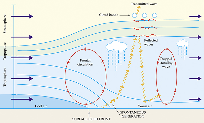 Figure 4. An atmospheric cold front with large-scale confluent flow moving left to right, which drives circulation (red arrows) around the front in the plane of the page. The rising air ahead of the front causes clouds and precipitation. Waves are spontaneously generated at the surface front and propagate ahead of it (yellow arrows). Some propagate through the tropopause into the stratosphere; they create horizontal bands of clouds at the interface through the introduction of moist tropospheric air. Ultimately, those waves transfer momentum to the stratospheric circulation. Other waves reflect and form troposphere-trapped standing waves, which may themselves cause clouds and rain.