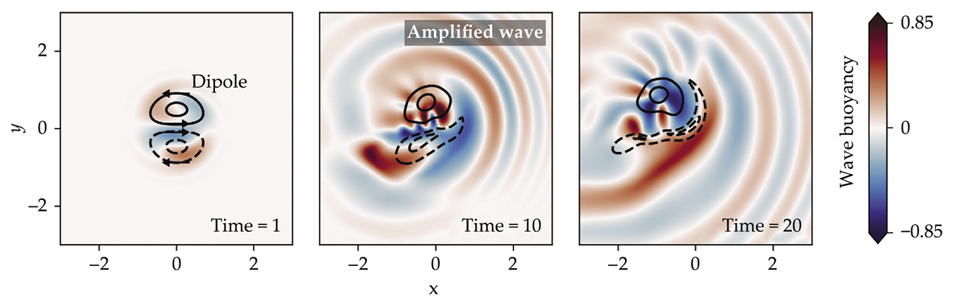 Stimulated emission occurs when a preexisting internal wave (color) interacts with a dipole (black contours show flow), or double eddy. In the panel sequence, the dipole weakens with time as its energy is transferred to the wave. The wave’s height, given here in terms of wave buoyancy, increases with time as it gains energy. All quantities are expressed in nondimensional units. (Adapted from ref.