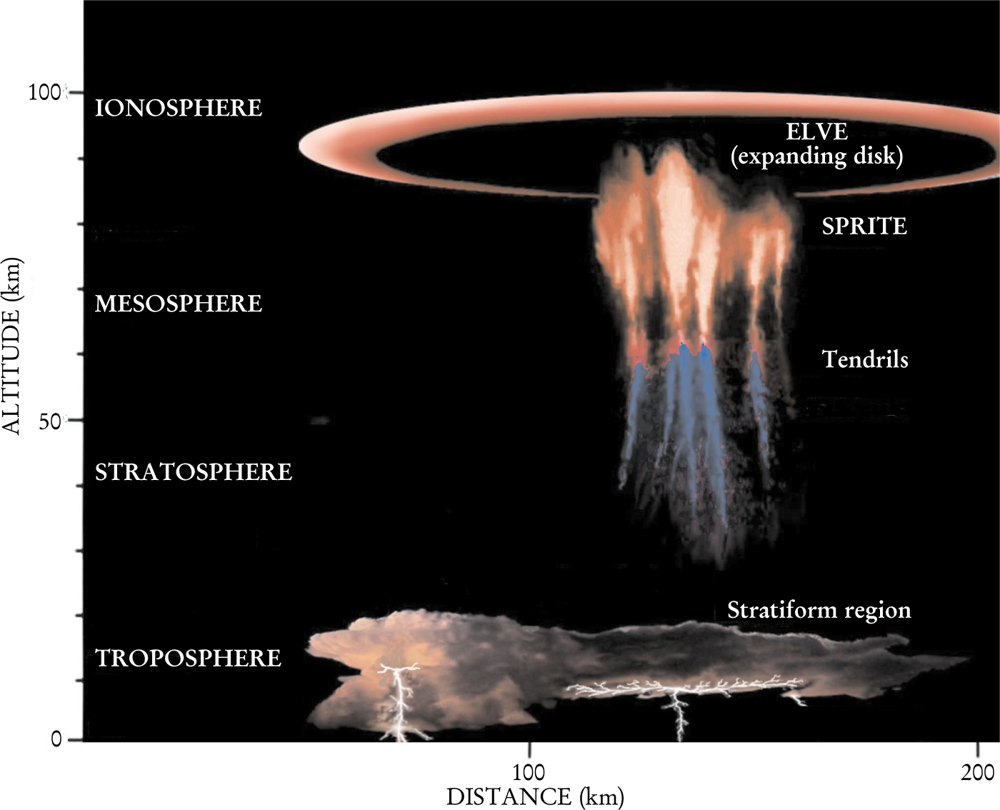 The ringlike elve in figure 1 (not “elf”: the acronym stands for “emissions of light and very low frequency perturbations from electromagnetically pulsed sources”) is centered on the vertical channel to ground, whereas the sprite lies above horizontally extensive so-called spider lightning in the lower portion of the stratiform cloud. The spider lightning’s horizontal extent is a manifestation of the large pancake-shaped reservoirs of electric charge that feed the positive ground flashes. Such lightning flashes are not generally found in ordinary isolated thunderclouds.