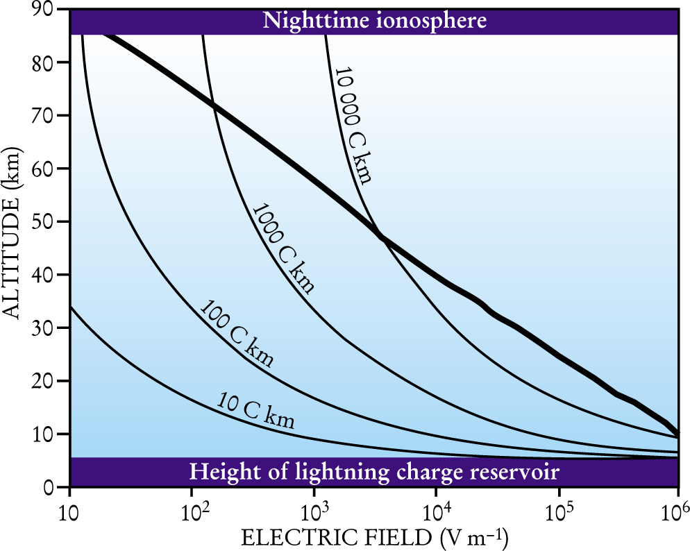 Wilson proposed that a positive cloud-to-ground flash of the sort depicted near the bottom of figure 1 could be envisioned as a sudden deposition of negative charge into the lower part of the cloud with a corresponding positive image charge appearing an equal distance beneath Earth’s surface. Lightning’s rearrangement of charge can therefore be represented as a vertical dipole with a charge moment equal to the product of the charge transferred and its height z above ground. The field of a vertical dipole declines like 1/z3, but the dielectric strength follows the density of air, which declines exponentially with altitude. These circumstances create an altitude range—well removed from the storm top—where the imposed electric field exceeds the dielectric strength and initiates a lightning-like discharge.
