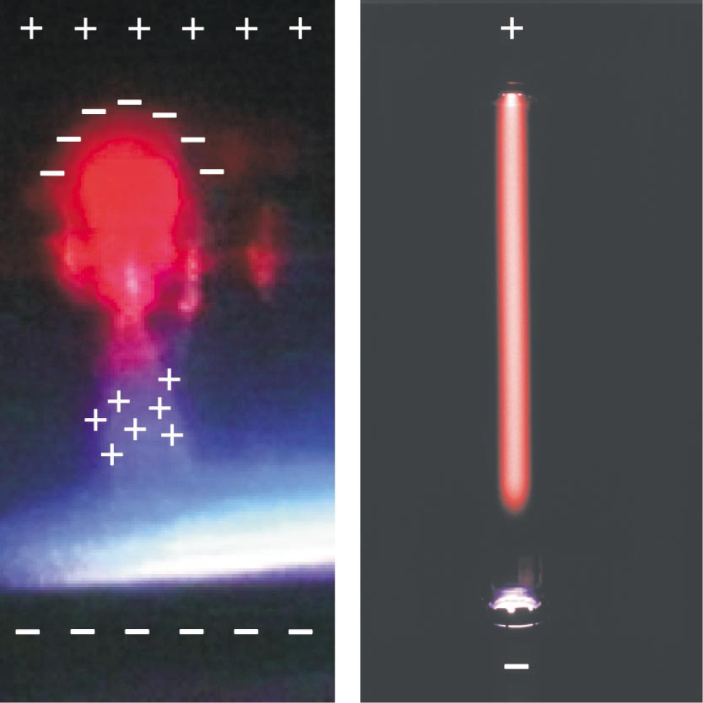 Figure 3. Sprite light in the atmosphere (left) and in a laboratory glow discharge tube (right). In both cases, the light near the positive (anode) end is red and arises from the collisional excitation of neutral nitrogen molecules by free electrons. Also in both cases, the light near the negative (cathode) end is blue and arises from the collisional excitation of N2+ ions by free electrons.