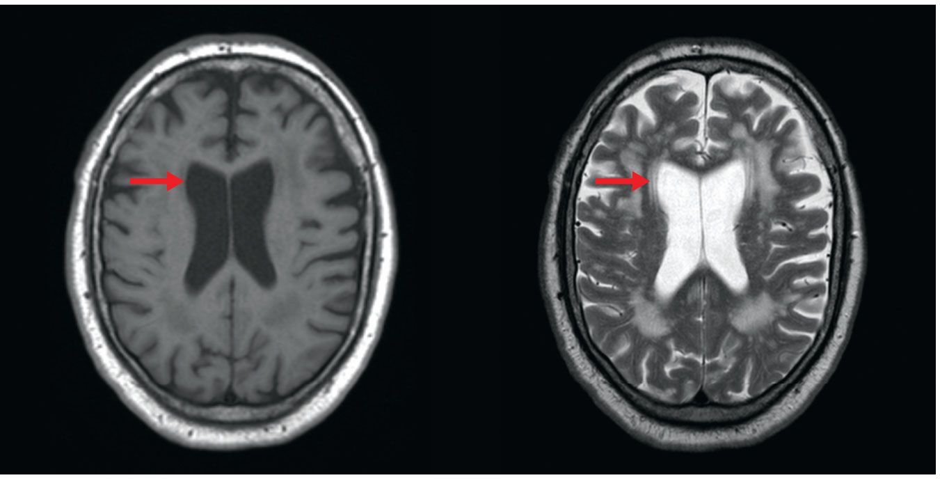 MRI of a brain with T1 (left) and T2 (right) weighting. T1 refers to the time required for precessing nuclei in tissue to relax to their equilibrium orientation in a magnetic field, and T2 refers to the time it takes the nuclei to lose their phase coherence. The timing of RF pulses can be chosen so that the MRI signal comes from tissue with the shortest T1 times or the longest T2 times. Images taken with those different timings demonstrate how MRI can be tuned to produce different signal intensities in the same tissue. Fluid-filled ventricles (red arrow) are darker than the brain tissue on the T1-weighted image and brighter on the T2-weighted image. (Images by David Jordan, University Hospitals Cleveland Medical Center.)