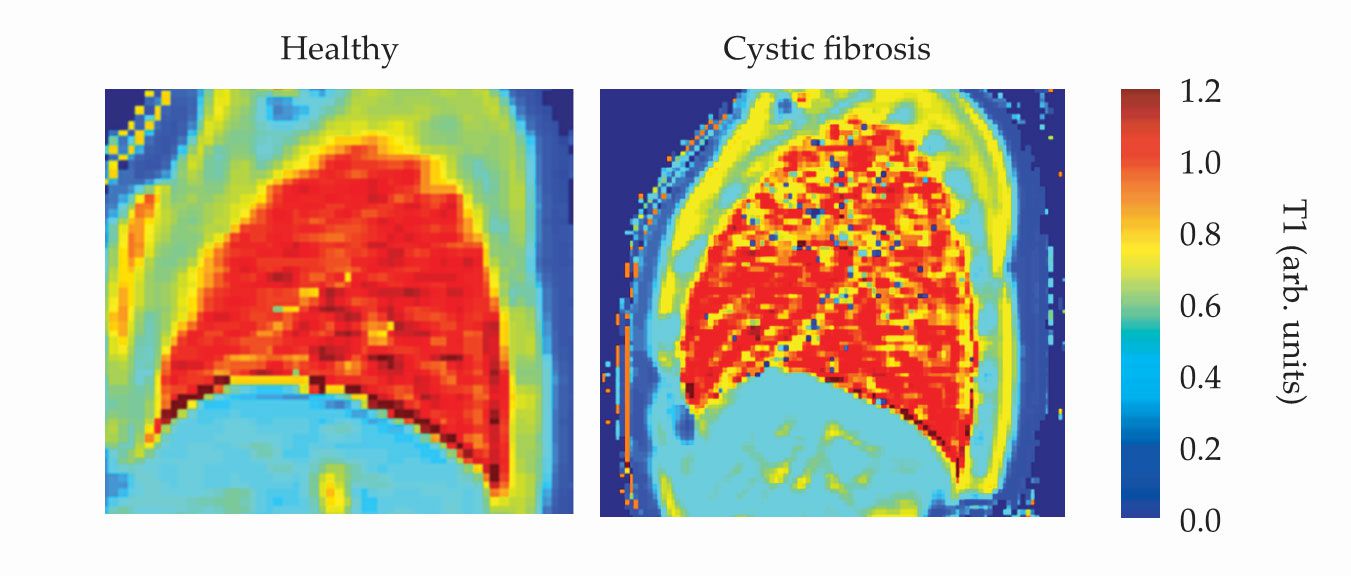 Qualitative evaluation of weighted images by a trained radiologist is an effective diagnostic tool (see figure 1 for an example), but interest is growing in quantitative measurements of tissue parameters to improve diagnosis. Water diffusivity and chemical concentrations can be measured quantitatively. The signal intensities in T1- and T2-weighted images are usually relative, however, and do not inherently represent absolute quantitative measurements of T1 or T2 relaxation times in the imaged tissue. Such measurements are possible, and efficient techniques to do so are an active area of research. Figure 2 shows an example of differences in quantitative T1 measurements for normal and diseased lung tissue in cystic fibrosis. Lung tissue is difficult to image using qualitative MRI because the signal level is inherently low, but quantitative T1 maps provide a clear visualization of disease.