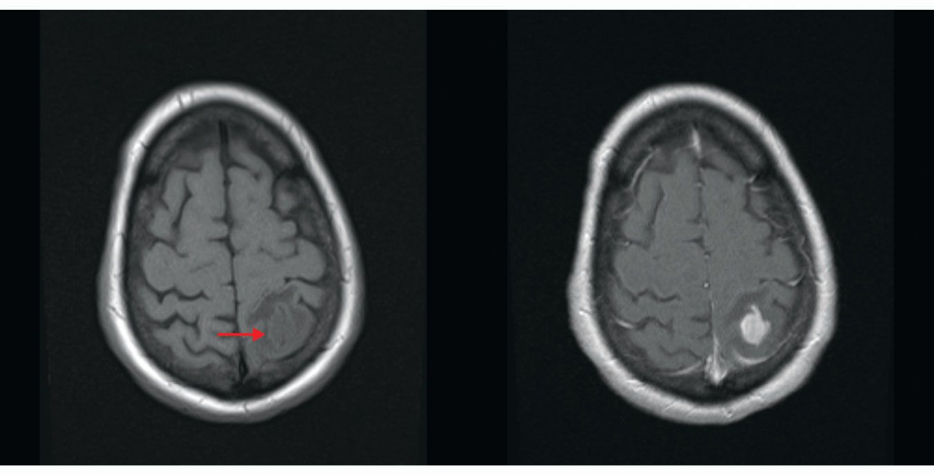 T1-weighted images of a brain without (left) and with (right) gadolinium contrast dye. The tumor (red arrow) is only subtly visible without the contrast; new blood vessel formation in the tumor results in high uptake of the dye, which makes the tumor much more visible in the contrast-enhanced image. (Images by David Jordan, University Hospitals Cleveland Medical Center.)
