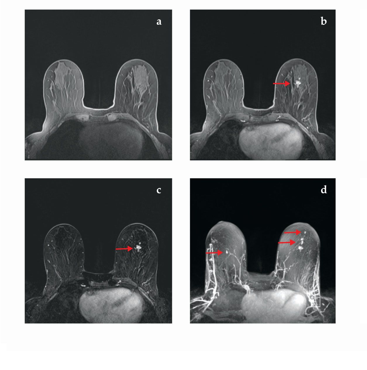 Fast-screening breast MRI.(a) In this T1-weighted image without contrast dye, no abnormalities are apparent. (b) With contrast dye injected into the tissue, this T1-weighted image shows a large lesion (red arrow) that’s easily seen. (c) This subtracted image, panel b minus panel a, improves the tumor’s visibility and the brightness of dense glandular tissue. (d) A so-called maximum intensity projection of all subtracted slices (such as panel c) reveals other small lesions (red arrows), including one in the contralateral breast. A radiologist can much more rapidly detect all suspicious lesions by viewing a single image of this type than by individually reviewing dozens of image slices. (Images by David Jordan, University Hospitals Cleveland Medical Center.)