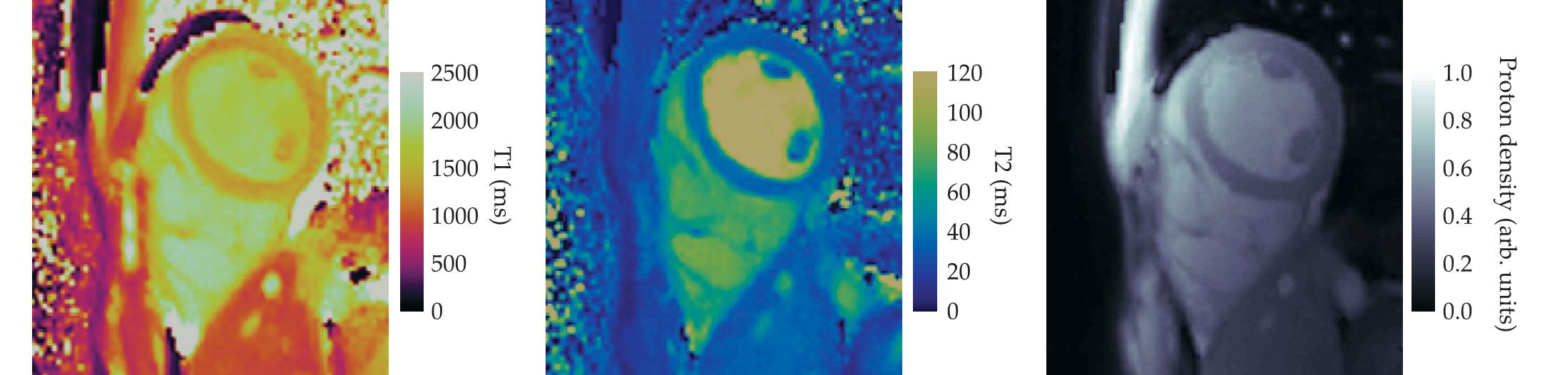 Magnetic resonance fingerprinting. In this image of a human heart, the technique provides quantitative maps of T1, T2, and proton density. All three images come from a single scan, whereas conventional MRI would require at least three separate scans to collect the same information. Clinical MRF research is underway to measure the effect of diseases and injuries on the three parameters. (Courtesy of Nicole Seiberlich, University of Michigan.)