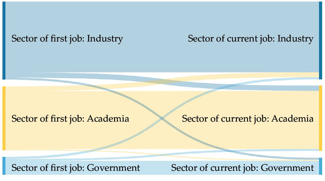 The sector in which a PhD physicist found their first job—private industry, government, or academia—is usually the same sector in which they currently work. By serving as a rotator for NSF, physicists can contribute to federal government work without switching the sector of their primary employment. (Adapted from ref. 1.)