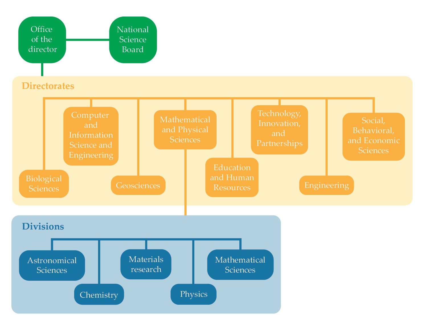NSF has eight science directorates. Each is led by an assistant director and is focused on funding particular areas of research: biological sciences; computer and information science and engineering; education and human resources; engineering; geosciences; mathematical and physical sciences; social, behavioral, and economic sciences; and technology, innovation, and partnerships. Each directorate’s purview is divided into a few divisions. In the Directorate for Mathematical and Physical Sciences, for example, the divisions are astronomical sciences, chemistry, materials research, mathematical sciences, and physics. Those divisions are each headed by a division director and employ program directors tasked with evaluating proposals, facilitating panel reviews, and liaising with researchers.