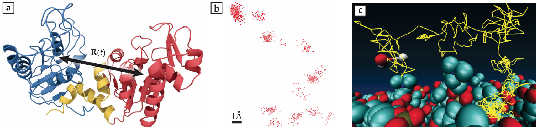 The structure of a protein and its surrounding water molecules exhibit intriguing dynamics. (a) The yeast globular protein phosphoglycerate kinase has three domains, shown here in red, yellow, and blue. Its internal fluctuations can be characterized by the relative position