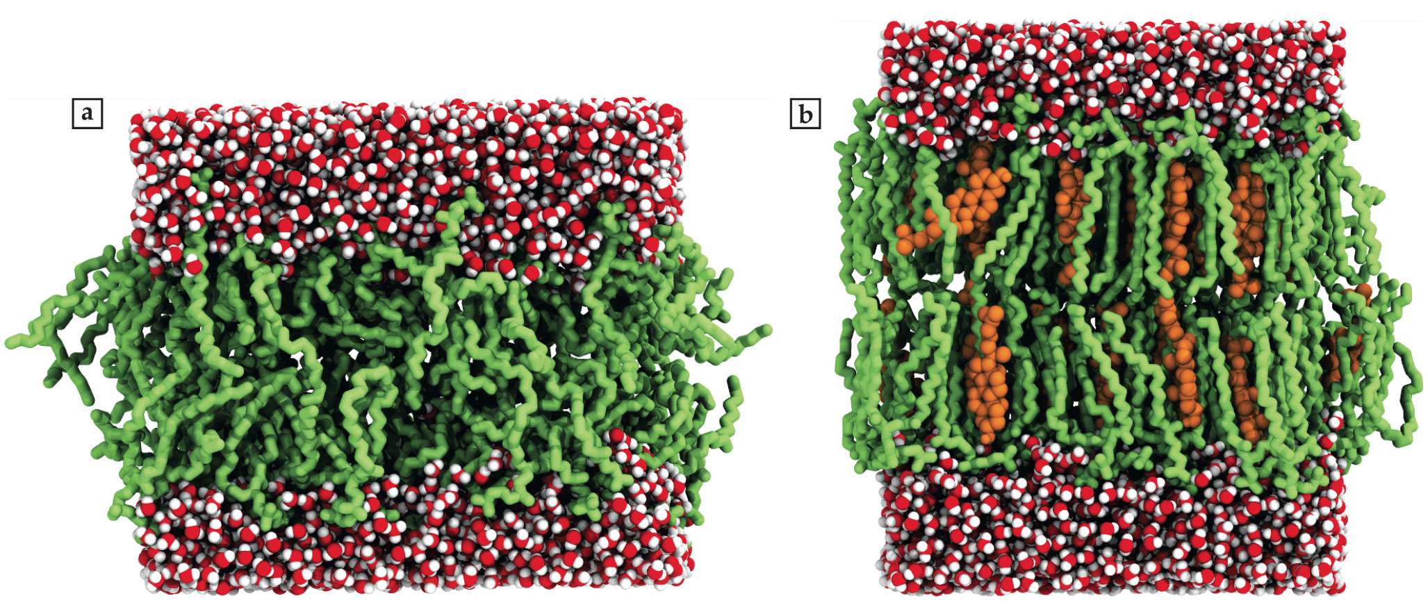 Snapshots of lipid bilayer membranes with adjacent water layers from molecular dynamics simulations show the effects of membrane disorder. (a) A single-component lipid bilayer (green) exists in a disordered liquid phase. Water molecules (red and white) surround the bilayer. (b) When cholesterols (orange) are added, the bilayer transitions to a liquid ordered phase. Note that the bilayer width increases with decreasing lipid-tail entropy. (Courtesy of Matti Javanainen.)
