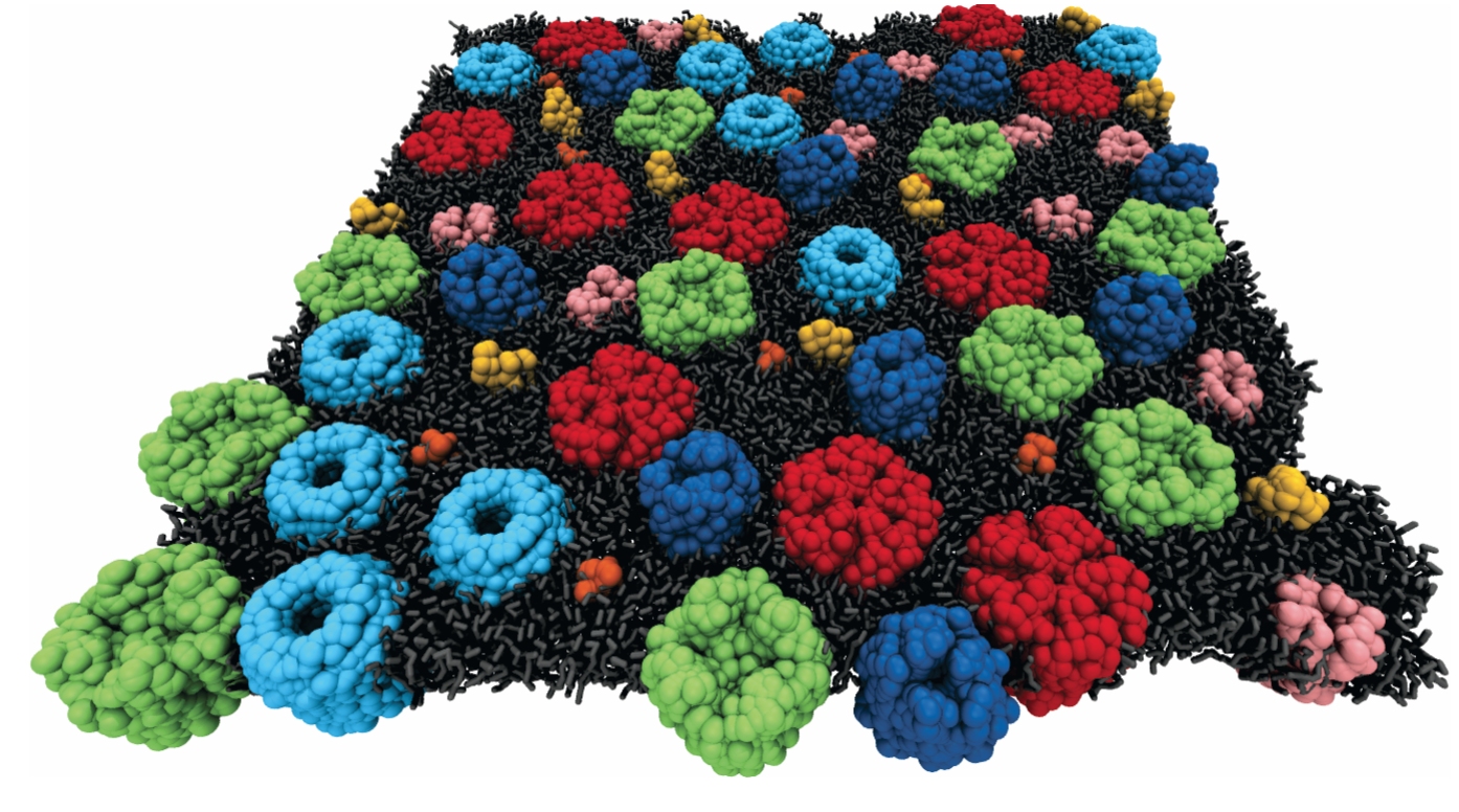 The lipids and proteins in bilayers interact both with each other and with their surroundings. To see the effects of those interactions, Eiji Yamamoto and colleagues at Keio University in Tokyo studied the motion of water molecules and proteins at the water–membrane interface. Their all-atom MD simulations showed that water molecules within 3.5 Å of the lipids are subdiffusive with