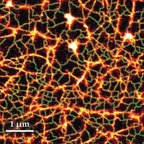 The cytoskeleton structure vicinal to the membrane of a human embryonic kidney cell can be probed by superresolution microscopy. The cortical cytoskeleton forms a scale-free fractal network (orange). The green lines show the compartmentalization of the membrane that is induced by the fractal actin structure. (Adapted from ref.