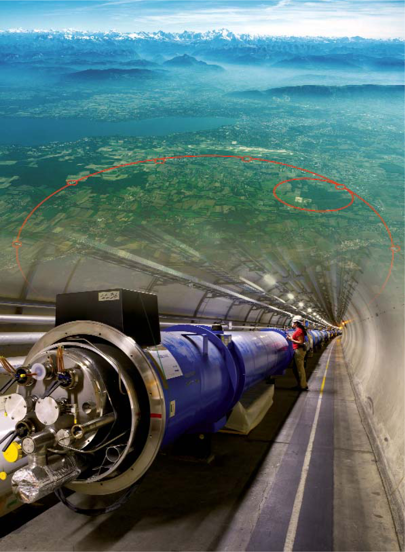 Figure 1. The Large Hadron Collider at CERN will smash together protons that have been accelerated to energies of 7 TeV. The illustration shows a string of superconducting magnets in the tunnel; the outer red curve indicates the 27-km-circumference ring that will house the LHC.
