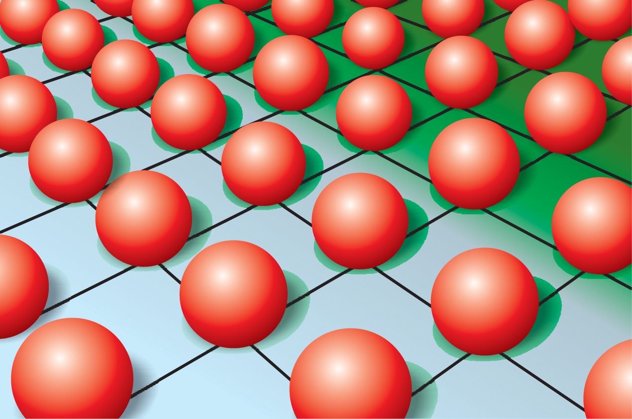Figure 4. Spacetimes admissible in string theory typically have more than four dimensions. The extra dimensions beyond the usual space and time are imperceptibly small. In this illustration, the plane represents the familiar four dimensions of space and time. Associated with every point of the 4D spacetime are internal dimensions, here represented as spheres.
