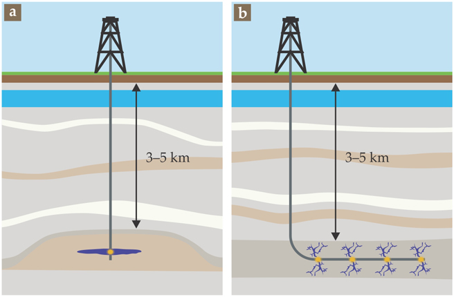 Figure 1. Traditional and high-volume fracking. (a) In traditional fracking treatments, a high-viscosity fluid creates a single hydraulic fracture through which oil or gas (or both) migrates to the production well. (b) In high-volume fracking, or super fracking, large volumes of a low-viscosity liquid create a wide distribution of hydraulic fractures. Fossil fuels can then migrate through the fracture network to the production well. The sketch here shows the result of a sequence of four high-volume fracking injections. Such sequential injections would not be possible without directional drilling, which creates a horizontal production well in the target stratum.