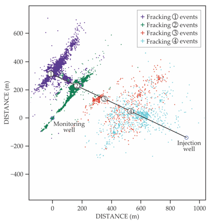 High-volume fracking creates a distribution of microseismic events that documents the complex fracture network generated by the fracking. Nowadays something like 10% of production wells are accompanied by one or more vertical monitoring wells that have seismometers distributed along their lengths. Those seismometers can locate microseismic events in real time, and the data they provide can help optimize injection rates.
