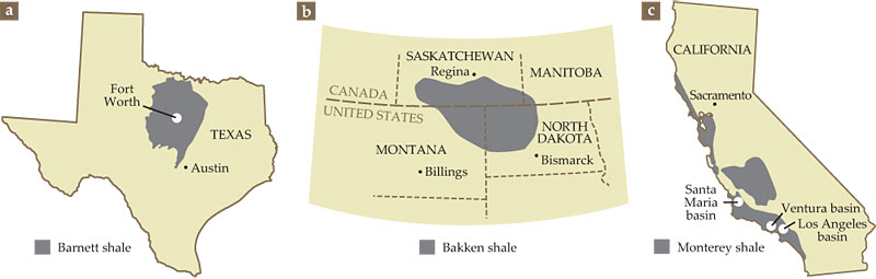 Figure 3. Show me the shale. The three maps here give the locations of important fossil-fuel-producing shales in the US. (a) The Barnett shale is in north central Texas. (b) The Bakken shale, in the Williston basin, encompasses regions of the US and Canada. (c) The Monterey shale extends along much of California. (Maps courtesy of Janice Fong.)