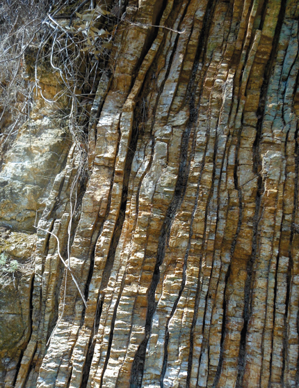 Figure 4. The highly fractured Monterey shale, exposed near the Hayward fault in Berkeley, California. Dark bands are black shale. Tectonic movements have brought this sedimentary rock to the surface and rotated the beds from horizontal to vertical. (Photograph by Eldridge Moores.)