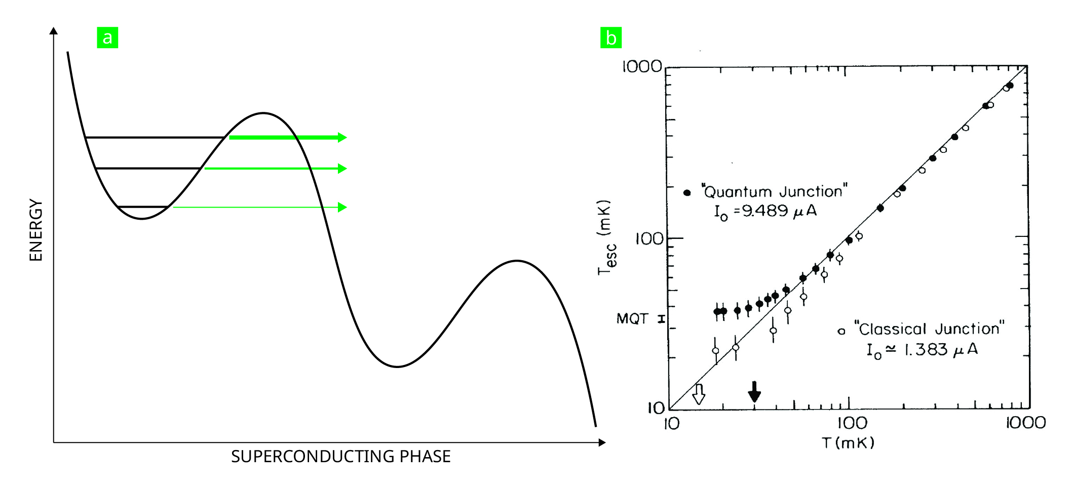 Applying a bias current to a Josephson junction transforms the flat sine-wave potential from figure 2 into a tilted one (a). The system can then prove its quantum nature by tunneling out of the metastable energy well. The plot in (b), from one of the laureates’ landmark papers, shows one clear demonstration of the effect. The horizontal coordinate T is the system’s real temperature, and the vertical coordinate Tesc is the temperature that would yield the observed escape rate if all the escapes happened classically. At higher temperatures the two are equal, but at lower temperatures they diverge: evidence of macroscopic quantum tunneling (MQT).