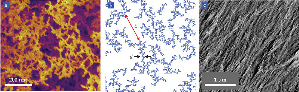 Aerogels can be isotropic or not. (a) Typical superfluid helium-3 investigations use a 98% porous silica aerogel such as seen in this scanning electron microscope image. (b) A two-dimensional view of a 3D simulation of the aerogel illustrates the strand size d and the correlation length ξ, essentially the size of the largest voids. (c) The polar phase of superfluid was discovered in a nematically ordered aerogel formed from alumina strands such as shown in this scanning electron microscope image.