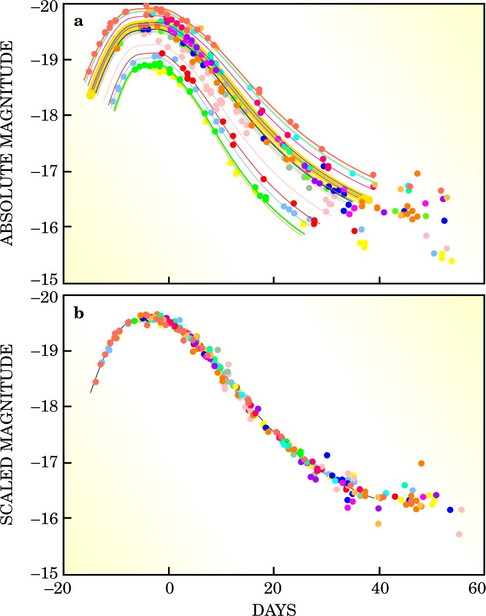 Figure 1. Light curves of nearby, low-redshift type Ia supernovae measured by Mario Hamuy and coworkers.7(a) Absolute magnitude, an inverse logarithmic measure of intrinsic brightness, is plotted against time (in the star’s rest frame) before and after peak brightness. The great majority (not all of them shown) fall neatly onto the yellow band. The figure emphasizes the relatively rare outliers whose peak brightness or duration differs noticeably from the norm. The nesting of the light curves suggests that one can deduce the intrinsic brightness of an outlier from its time scale. The brightest supernovae wax and wane more slowly than the faintest. (b) Simply by stretching the time scales of individual light curves to fit the norm, and then scaling the brightness by an amount determined by the required time stretch, one gets all the type Ia light curves to match.5,8