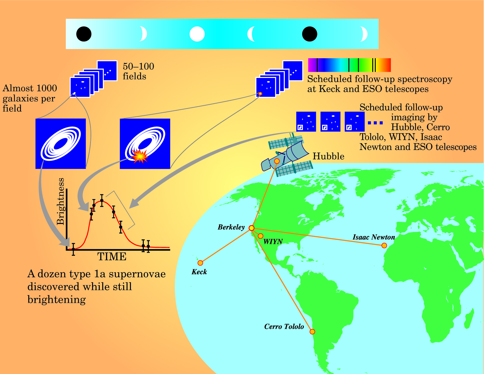 In retrospect, the solution we found seems obvious—though much effort was needed to implement it and prove it practical. By specific timing of the requested telescope schedules (see figure 2), we could guarantee that our wide-field imager would harvest a batch of about a dozen freshly exploded supernovae, all discovered on a pre-specified observing date during the dark phase of the moon. (A bright moon is an impediment to the follow-up observation.) We first demonstrated this supernovae-on-demand methodology in 1994. From then on, proposals for time at major ground-based telescopes could specify discovery dates and roughly how many supernovae would be found and followed up. This approach also made it possible to use the Hubble Space Telescope for follow-up light-curve observations, because we could specify in advance the one-square-degree patch of sky in which our wide-field imager would find its catch of supernovae. Such specificity is a requirement for advance scheduling of the HST. By now, the Berkeley team had grown to include some dozen collaborators around the world, and was called the Supernova Cosmology Project (SCP).