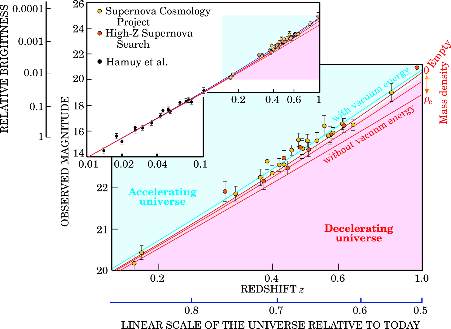 Figure 3. Observed magnitude versus redshift is plotted for well-measured distant12,13 and (in the inset) nearby7 type Ia supernovae. For clarity, measurements at the same redshift are combined. At redshifts beyond z= 0.1 (distances greater than about 109 light-years), the cosmological predictions (indicated by the curves) begin to diverge, depending on the assumed cosmic densities of mass and vacuum energy. The red curves represent models with zero vacuum energy and mass densities ranging from the critical density ρc down to zero (an empty cosmos). The best fit (blue line) assumes a mass density of about ρc/3 plus a vacuum energy density twice that large—implying an accelerating cosmic expansion.