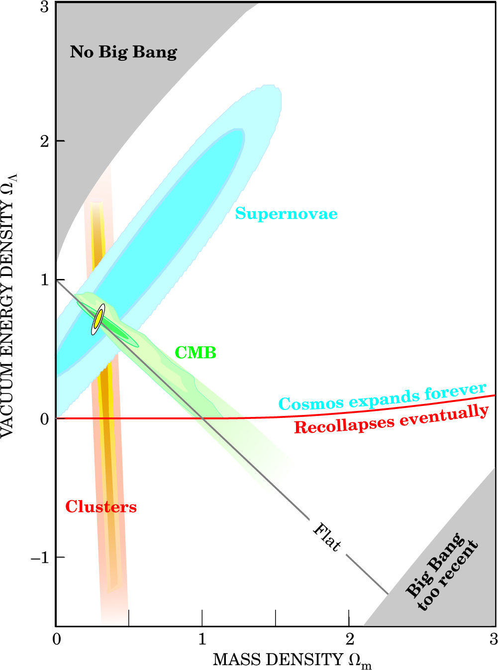 Figure 5. In the cosmological parameter space of the normalized mass and vacuum energy densities Ωm and ΩΛ, three independent sets of observations—high-redshift super novae, galaxy cluster inventories, and the cosmic microwave background—converge nicely near Ωm = 0.3 and ΩΛ = 0.7. The small yellow contour in this region indicates how well we expect the proposed SNAP satellite experiment to further narrow down the parameters. The inflationary expectation of a flat cosmos (Ωm + ΩΛ = 1) is indicated by the black diagonal. The red curve separates an eternally expanding cosmos from one that ends in a “Big Crunch.”