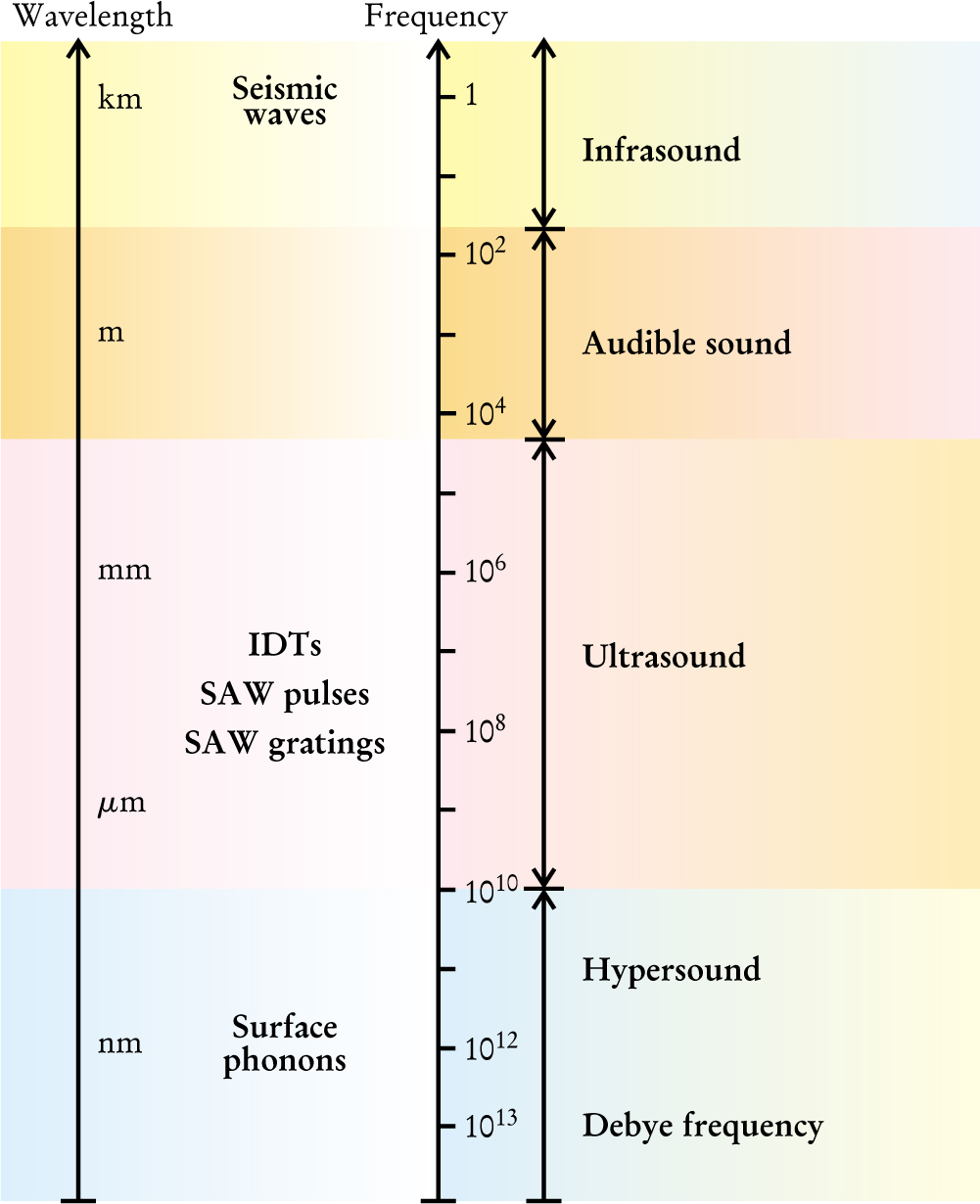 Figure 2. Surface acoustic waves can be found over a broad frequency spectrum. Current research extends from seismic waves in the infrasound region to interdigital transducers (IDTs) and to laser-generated SAW pulses and transient gratings in the ultrasound region.