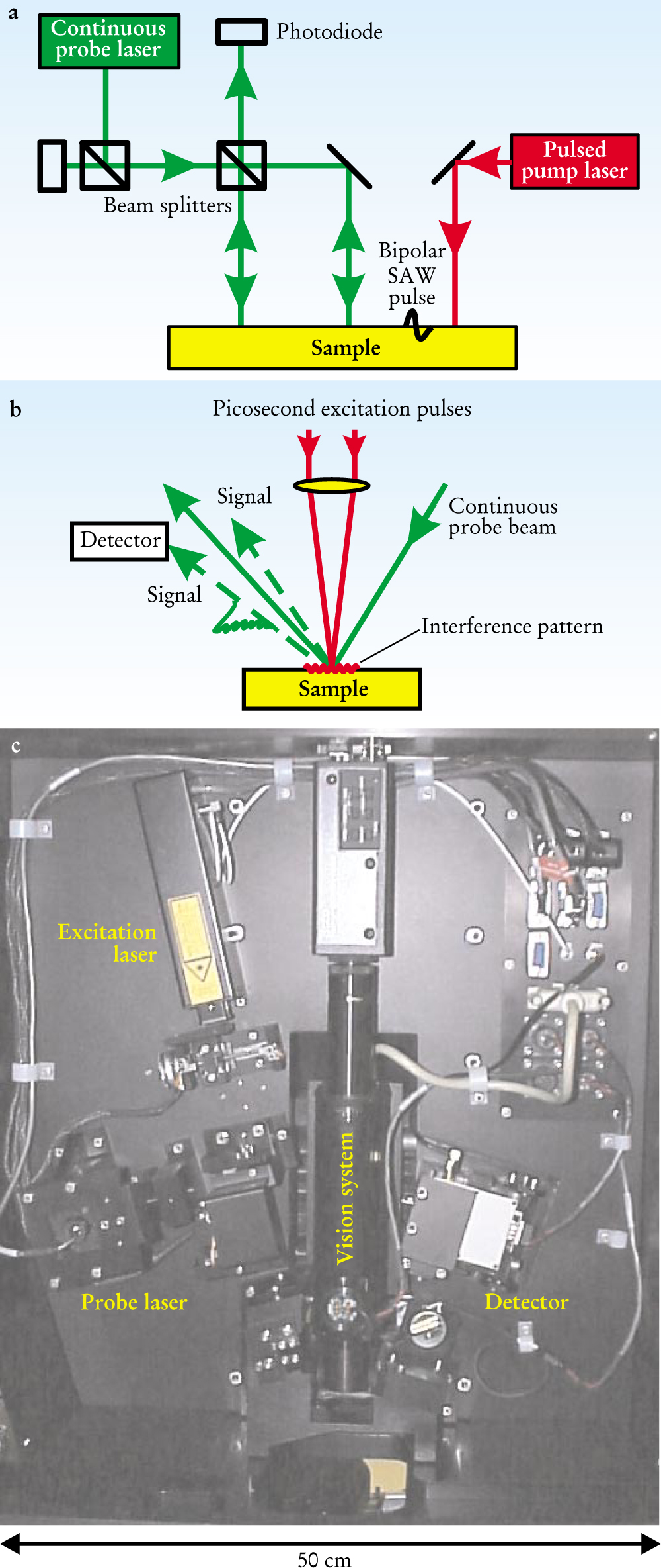 Figure 3. Laser techniques for exciting and detecting surface acoustic waves (SAWs). (a) A picosecond pulsed laser launches a coherent broadband SAW pulse. The transient displacement caused by the propagating surface wave is monitored with a continuous wave probe laser using a Michelson interferometer. (b) If two temporally coincident picosecond laser pulses are crossed at the surface, the resulting interference pattern excites a transient laser grating that generates two narrowband counterpropagating SAW trains by thermoelastic excitation. Diffraction of a probe laser is used to detect the temporal evolution of the grating. (c) An inside view of a commercially available SAW analysis system that uses narrowband wave trains.