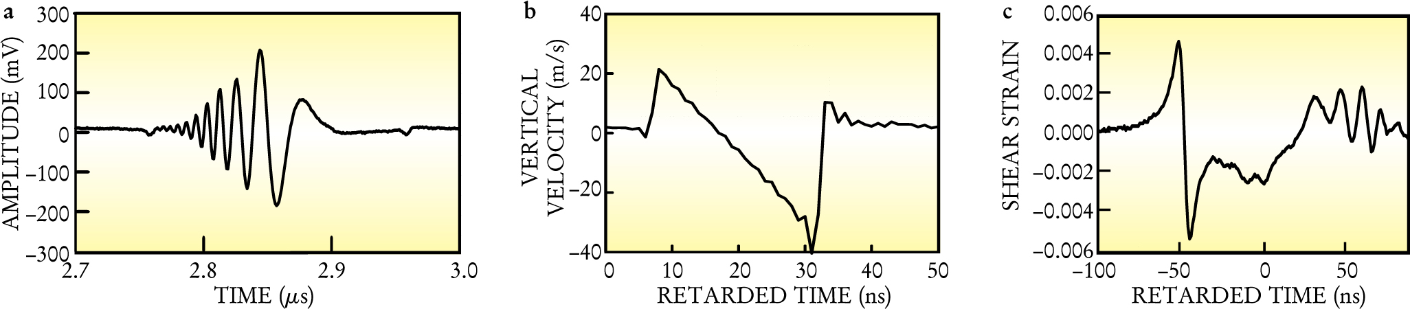 Figure 4. Shapes of SAW pulses. (a) For a silicon surface covered by a 200-nm cubic boron nitride film, dispersion effects make an initially bipolar pulse evolve into this characteristically oscillatory waveform after traveling about 14 mm from the source. Details of the oscillation contain information about material properties. (b) Nonlinearities turned an initially bipolar pulse into this shape with steep shocks after it traveled 18 mm across a silicon surface. In the retarded time frame, t = 0 corresponds to the phase point that propagates with the linear Rayleigh velocity of the substrate. A negative retarded time describes the faster part of the wave, and a positive time the slower part. (c) This solitary pulse kept its shape essentially unchanged as it traveled about 17 mm across isotropic fused silica covered with a nickel-chromium layer 300 nm thick.