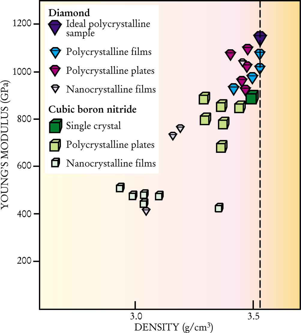 Figure 5. Elastic and mechanical properties of materials can be determined using surface acoustic waves. Here are shown the Young’s modulus (stiffness) and the density, both extracted from SAW experiments, for diamond and cubic boron nitride samples. The films and plates were grown using chemical vapor deposition with differing amounts of methane gas, and hence different growth rates. The most slowly grown diamond samples were closest to the stiffness and density (dashed line) of a statistically averaged ideal polycrystalline sample.