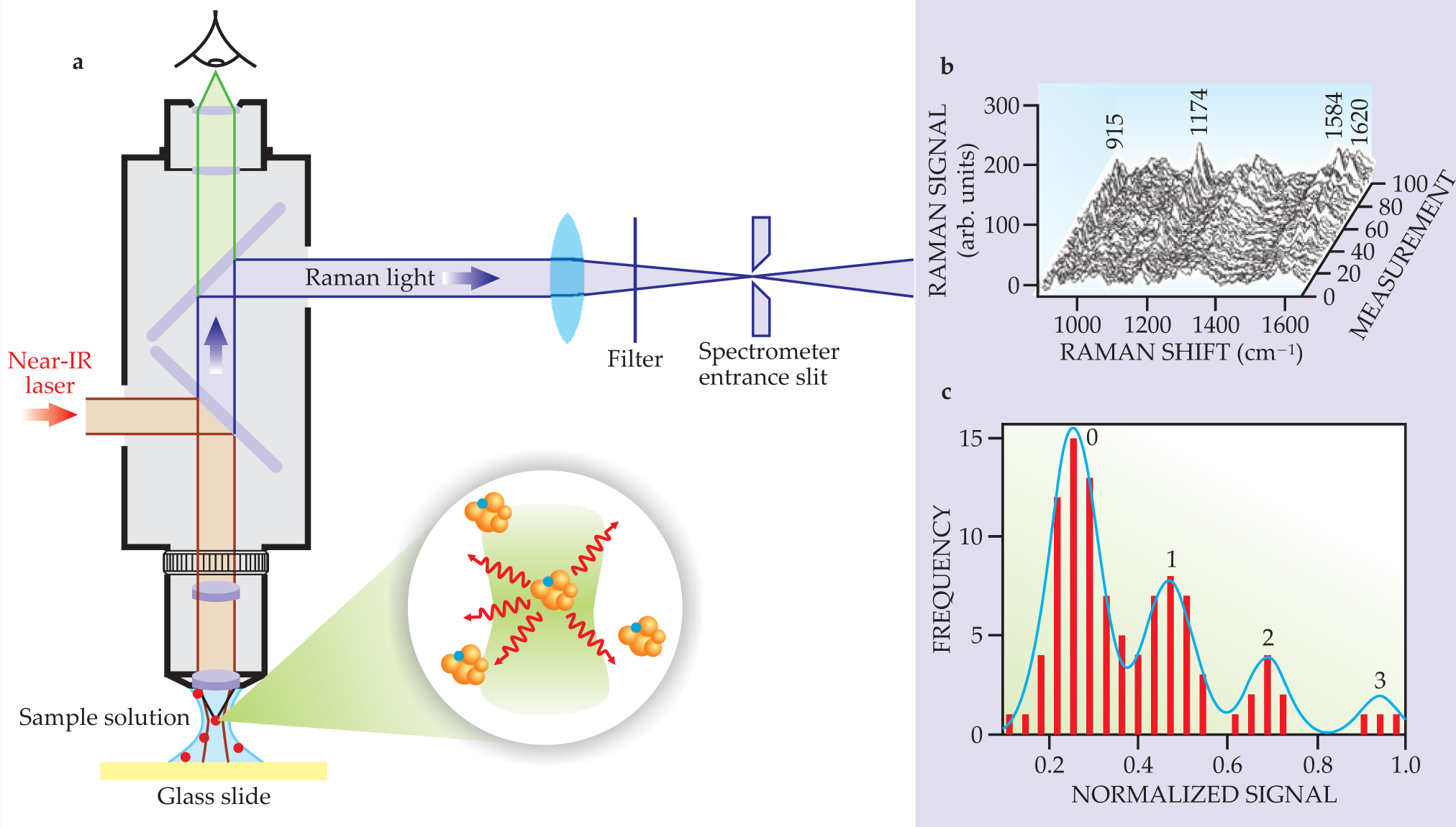 Figure 2. Single-molecule SERS. (a) A microscope attachment is used to focus near-IR laser light on a small volume of solution containing silver nanoclusters and attached target molecules (crystal violet dye) and channel the Raman-scattered light to a spectrometer. At concentrations around 10−14 mol/L, the molecules are dilute enough to ensure that, on average, no more than one molecule is in the focus volume at a time. The concentration, roughly 1/100 the concentration of the metal aggregates, means that statistically one out of 100 nanoclusters carries a single target molecule. (b) SERS spectra show the result of 100 separate measurements, one per second. (c) A statistical analysis of the Raman signals from one characteristic mode (at 1174 cm−1) indicates that the signals follow a Poisson distribution. The plot reflects the probability of finding 0, 1, 2, or 3 molecules in the probed volume during the actual measurement.