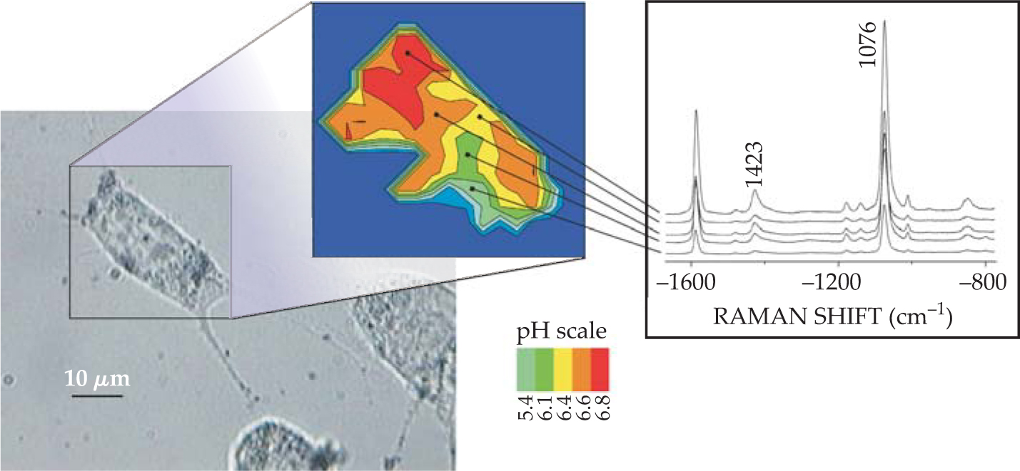 Figure 3. Probing and imaging a live cell filled with gold nanoparticles. Surface-enhanced Raman scattering measures the pH-sensitive spectrum of 4-mercaptobenzoic acid on the gold particles. The relative intensity ratios of the Raman lines at 1423 cm−1 and 1076 cm−1 can be calibrated to the pH levels to map them out in different cellular compartments. Each spectrum was collected in 1 second using 3-mW, 830-nm continuous-wave laser excitation.