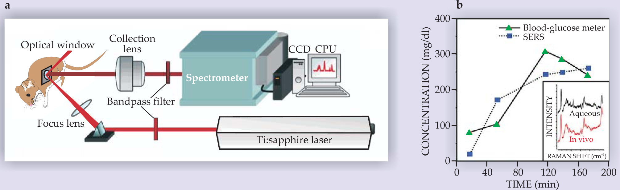 Figure 4. Sensing glucose concentrations in vivo. (a) A rat with a surgically implanted sensor made from a monolayer of silver nanoclusters is integrated into a conventional Raman-spectroscopy system. Glucose molecules can quickly adsorb and desorb on the prepared surface. (b) As glucose is intraveneously injected into the rat intermittently over three hours, researchers plot glucose concentration measured using the implanted SERS sensor (blue), along with measurements made with a commercial blood-glucose meter (green). The inset shows a typical in vivo spectrum, compared with an ex vivo aqueous spectrum of the same surface.