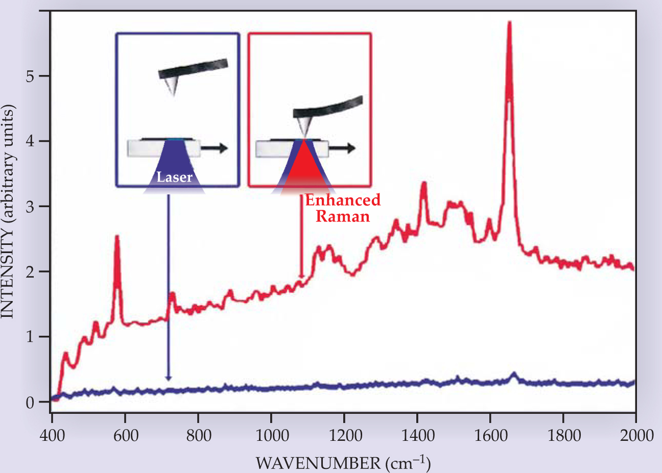 Figure 5. Tip-enhanced Raman spectroscopy. Two Raman spectra of brilliant cresyl blue dye molecules dispersed on a glass are pictured here. One (blue) is made as a silver-coated atomic-force-microscope tip hovers well away from the surface, and the other (red) is made with the metal tip nanometers from the surface. Raman excitation and the collection of scattered light are performed from below the glass. The presence of the metal tip near the sample surface greatly enhances the Raman signal.