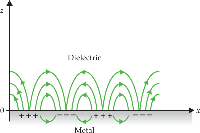 Electric field lines (green) and charge distributions associated with a surface plasmon traveling on a metal–dielectric interface.
