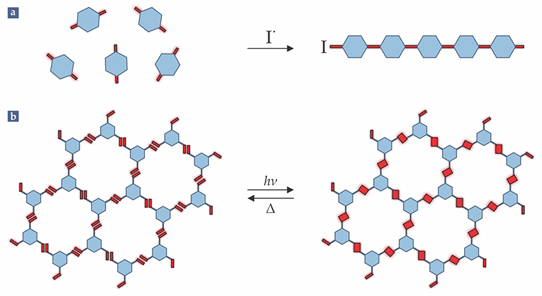 Polymerization in flatland. (a) In conventional, linear polymerization, each molecular building block (blue) has two reactive sites (red). An initiating radical I• triggers the assembly of the bifunctional monomers into a chain. (b) In two-dimensional polymerization, each monomer must have at least three reactive sites. Intermolecular forces are exploited to coax the monomers into alignment, and light is applied to stimulate covalent bonding between neighboring monomers’ reaction sites. Upon thermal treatment (Δ) the polymer depolymerizes and reverts to monomers.